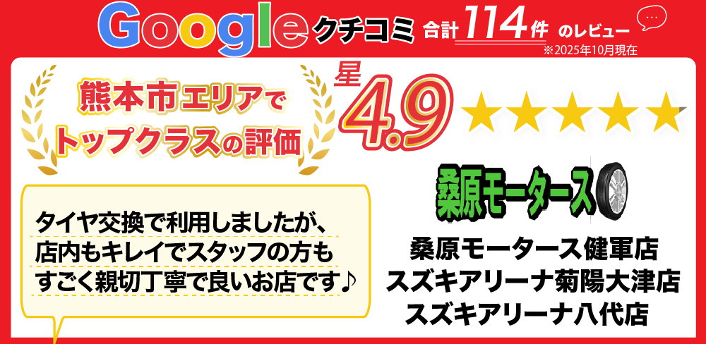 タイヤ交換店 桑原モータース 熊本市東区 健軍店・スズキアリーナ菊陽大津店・スズキアリーナ八代店では、地域最安値帯の工賃価格で安くお持ち込みのタイヤ交換・取付を実施しています。